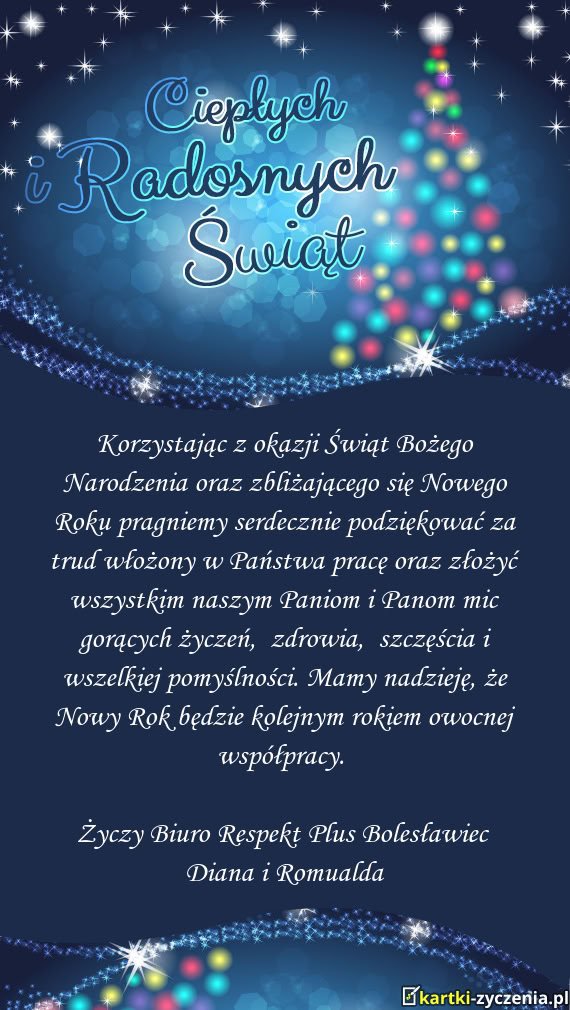 Korzystając z okazji Świąt Bożego Narodzenia oraz zbliżającego się Nowego Roku pragniemy serdecznie podziękować za trud włożony w Państwa pracę oraz złożyć wszystkim naszym Paniom i Panom moc gorących życzeń, zdrowia, szczęścia i wszelkiej pomyślności. Mamy nadzieję, że Nowy Rok będzie kolejnym rokiem owocnej współpracy.