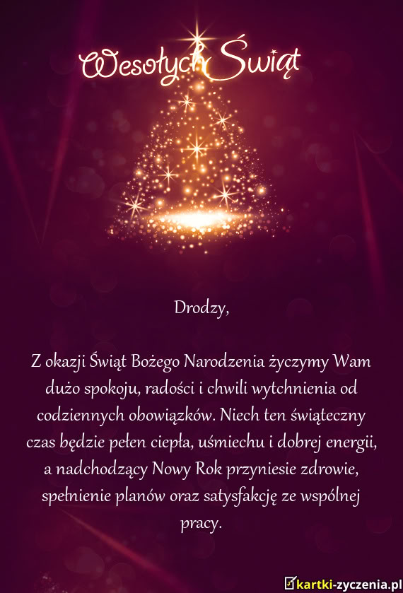 Wszystkim naszym Parterom, Współpracownikom i Klientom życzymy, aby czas świąt był okazją do odpoczynku i zadumy, a także wypełniał Wasze serca nadzieją i dodawał sił, tak byście mogli zrealizować wszystkie swoje plany.