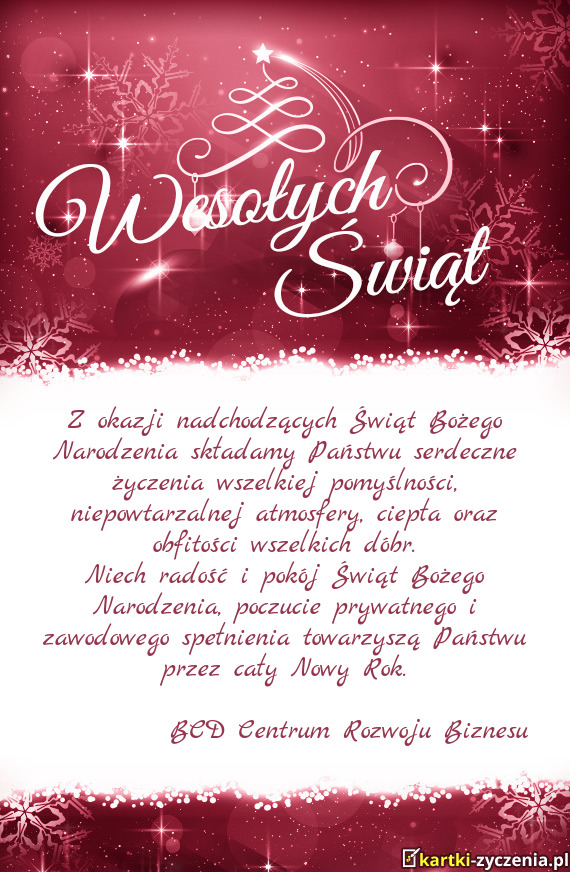 Z okazji nadchodzących Świąt Bożego Narodzenia składamy Państwu serdeczne życzenia wszelkiej pomyślności, niepowtarzalnej atmosfery, ciepła oraz obfitości wszelkich dóbr.