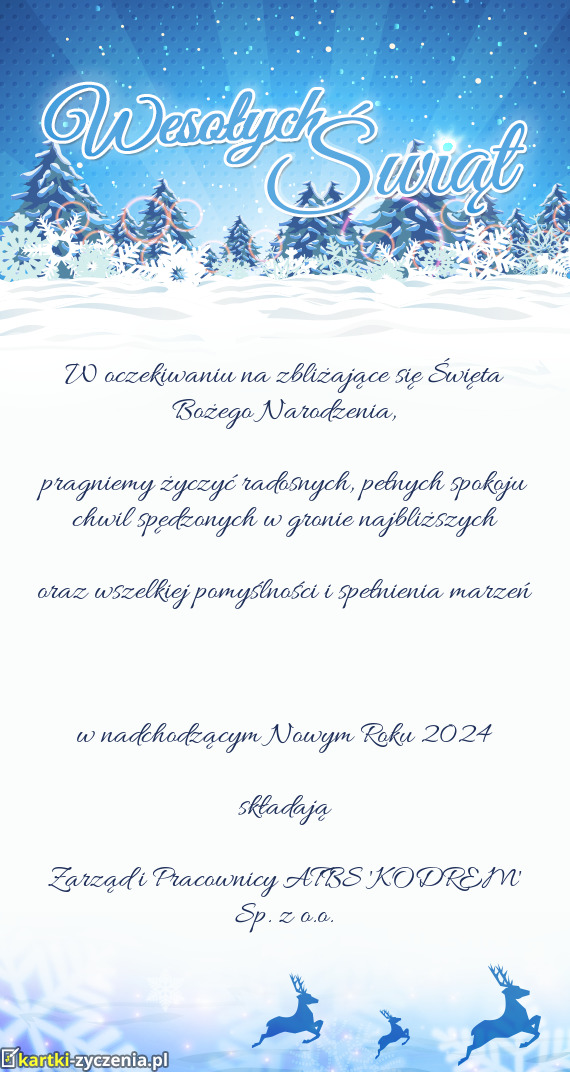 Pragniemy życzyć radosnych, pełnych spokoju chwil spędzonych w gronie najbliższych - Gotowa Kartka bożonarodzeniowa