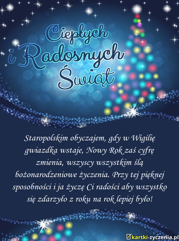 Staropolskim obyczajem, gdy w Wigilię gwiazdka wstaje, Nowy Rok zaś cyfrę zmienia, wszyscy wszystkim ślą bożonarodzeniowe życzenia. Przy tej pięknej sposobności i ja życzę Ci radości aby wszystko się zdarzyło z roku na rok lepiej było!