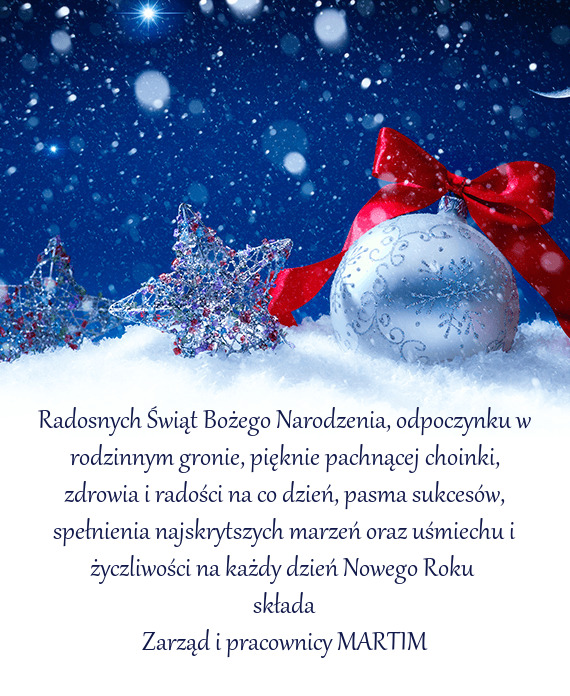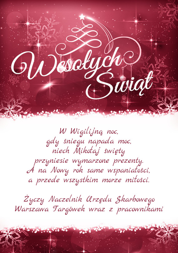 Radosnych Świąt Bożego Narodzenia, odpoczynku w rodzinnym gronie, pięknie pachnącej choinki, zdrowia i radości na co dzień, pasma sukcesów, spełnienia najskrytszych marzeń oraz uśmiechu i życzliwości na każdy dzień Nowego Roku