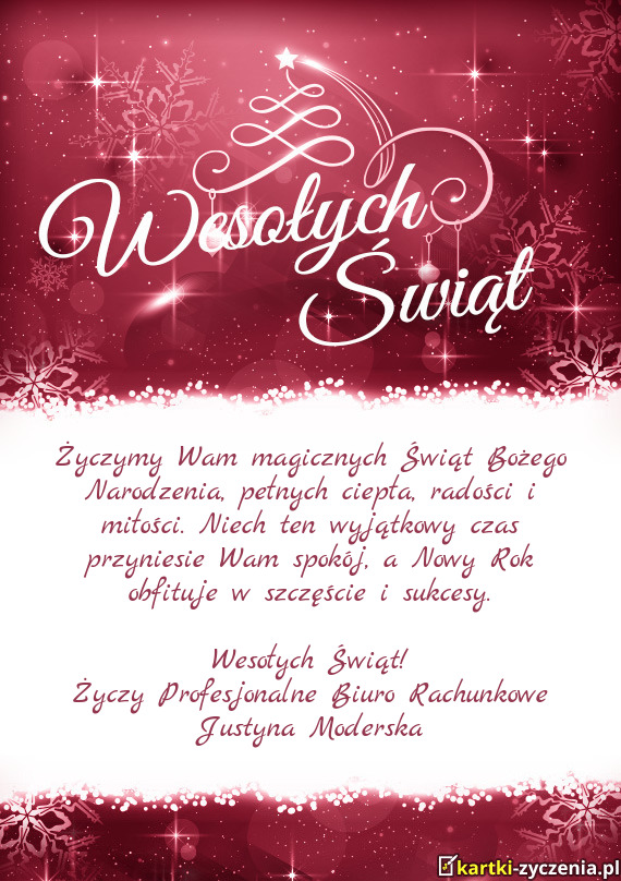 Cudownych i mroźnych Świąt Bożego Narodzenia, prawdziwej zimy za oknem i ciepła rodzinnego. Niepowtarzalnych wzruszeń i zaskakujących prezentów.