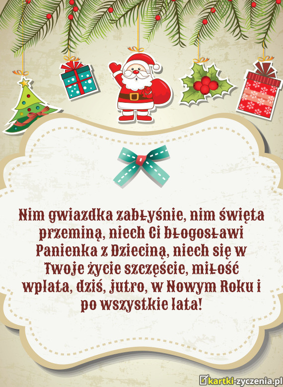 Nim gwiazdka zabłyśnie, nim święta przeminą, niech Ci błogosławi Panienka z Dzieciną, niech się w Twoje życie szczęście, miłość wplata, dziś, jutro, w Nowym Roku i po wszystkie lata!
