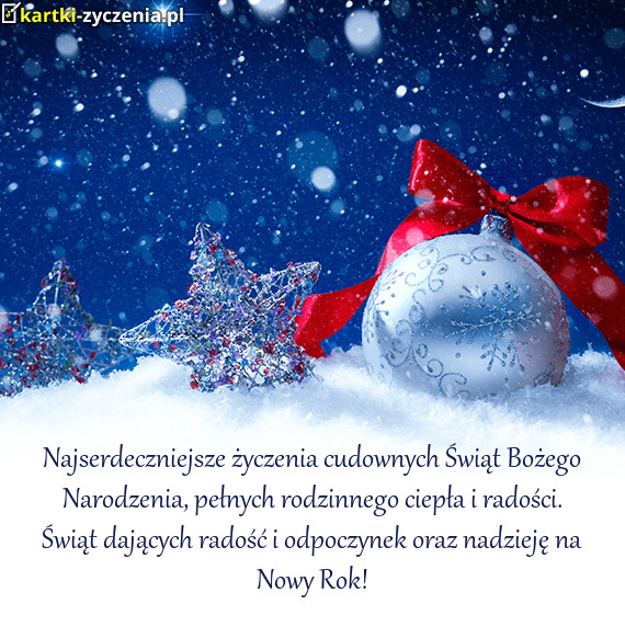 Najserdeczniejsze życzenia cudownych Świąt Bożego Narodzenia, pełnych rodzinnego ciepła i radości. Świąt dających radość i odpoczynek oraz nadzieję na Nowy Rok!