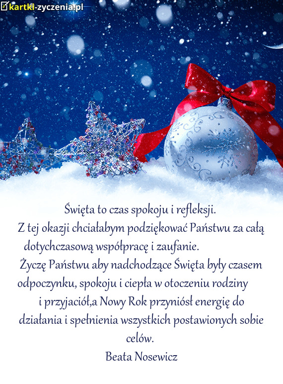 Z tej okazji chciałabym podziękować Państwu za całą dotychczasową współpracę i zaufanie. Życzę Państwu aby nadchodzące Święta były czasem odpoczynku, spokoju i ciepła w otoczeniu rodziny i przyjaciół,a Nowy Rok przyniósł energię do działania i spełnienia wszystkich postawionych sobie celów.