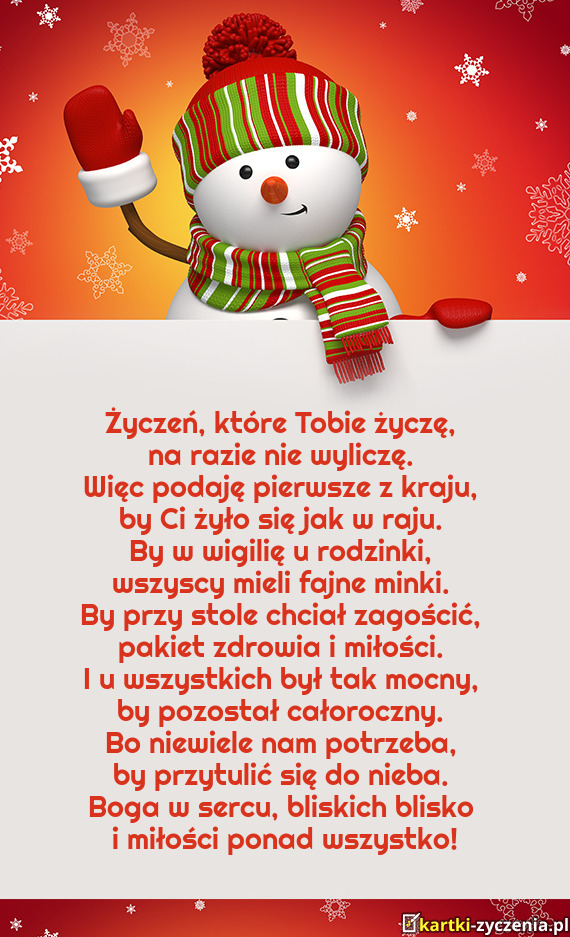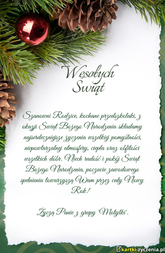 Szanowni Rodzice, kochane przedszkolaki, z okazji Świąt Bożego Narodzenia składamy najserdeczniejsze życzenia wszelkiej pomyślności, niepowtarzalnej atmosfery, ciepła oraz obfitości wszelkich dóbr. Niech radość i pokój Świąt Bożego Narodzenia, poczucie zawodowego spełnienia towarzyszą Wam przez cały Nowy Rok!