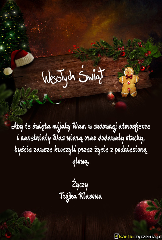Aby te święta mijały Wam w cudownej atmosferze i napełniały Was wiarą oraz dodawały otuchy, byście zawsze kroczyli przez życie z podniesioną głową.