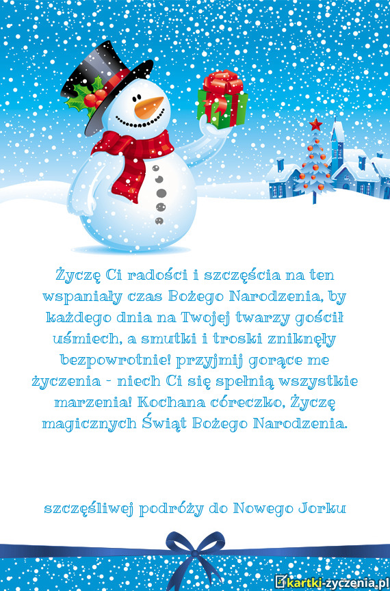Życzę Ci radości i szczęścia na ten wspaniały czas Bożego Narodzenia, by każdego dnia na Twojej twarzy gościł uśmiech, a smutki i troski zniknęły bezpowrotnie! przyjmij gorące me życzenia – niech Ci się spełnią wszystkie marzenia! Kochana córeczko, Życzę magicznych Świąt Bożego Narodzenia.