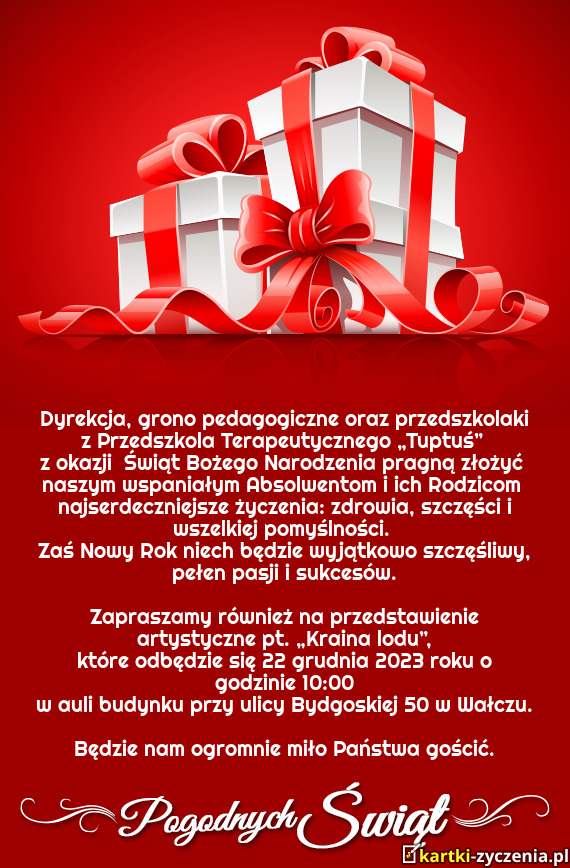 Życzę Tobie radosnych i spokojnych świąt Bożego Narodzenia spędzonych w gronie rodzinnym. Obfitości przy stole, pięknie pachnącej choinki, zdrowia, uśmiechu i życzliwości – nie tylko od święta, ale też na co dzień. Niech w Twym domu zagości mnóstwo radości, bliskości i miłości.