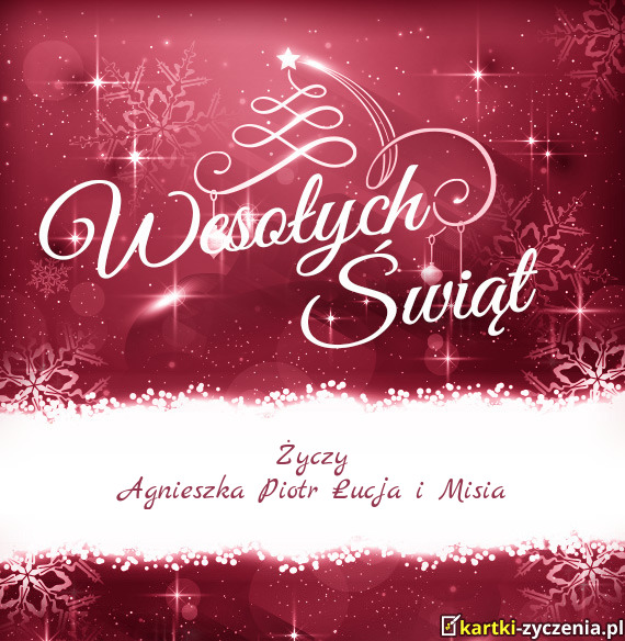 ūyczy Agnieszka Piotr Łucja i Misia - Gotowa Kartka bożonarodzeniowa