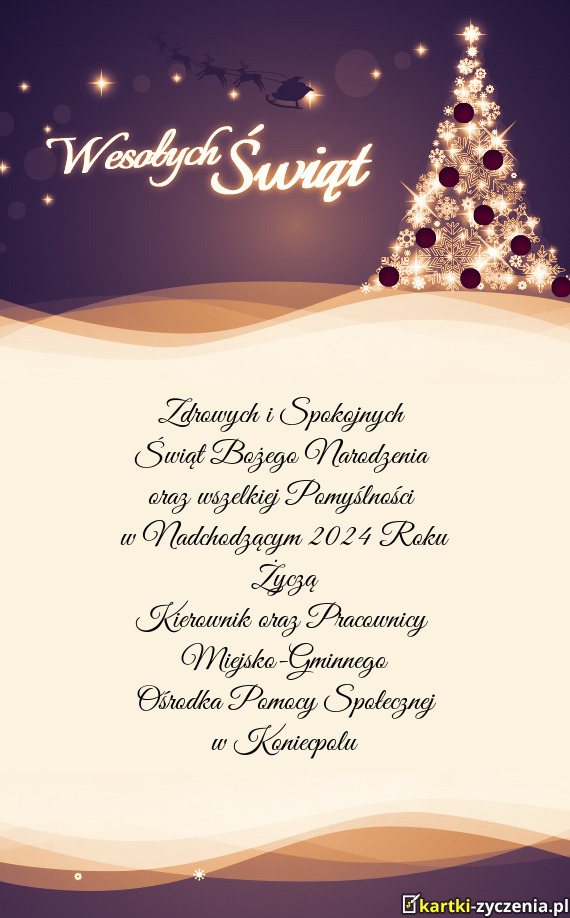 Jeden jest wieczór tak pełen słodyczy, Co wszystkie serca łączy i jednoczy. Człowiek dobrze człowiekowi życzy i wszyscy jasno patrzą sobie w oczy. Wesołych świąt Bożego Narodzenia.