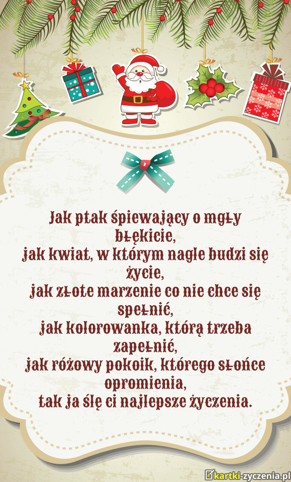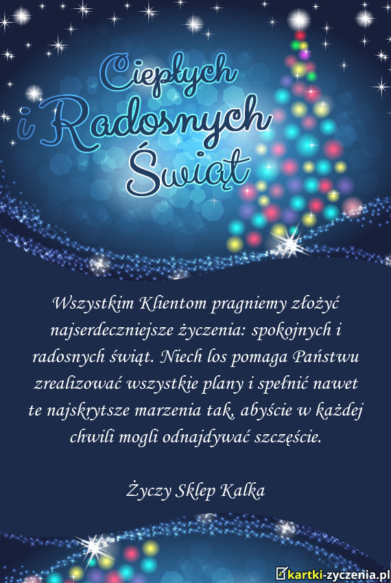 Wszystkim Klientom pragniemy złożyć najserdeczniejsze życzenia: spokojnych i radosnych świąt. Niech los pomaga Państwu zrealizować wszystkie plany i spełnić nawet te najskrytsze marzenia tak, abyście w każdej chwili mogli odnajdywać szczęście.