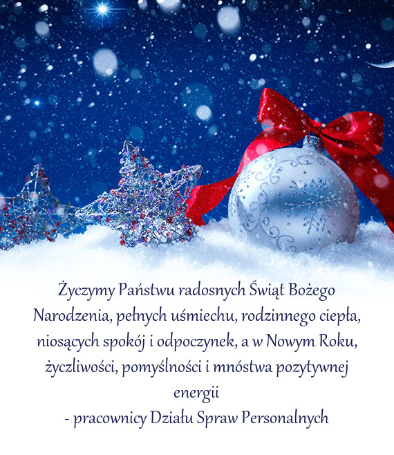 Życzymy Państwu radosnych Świąt Bożego Narodzenia, pełnych uśmiechu, rodzinnego ciepła, niosących spokój i odpoczynek, a w Nowym Roku, życzliwości, pomyślności i mnóstwa pozytywnej energii