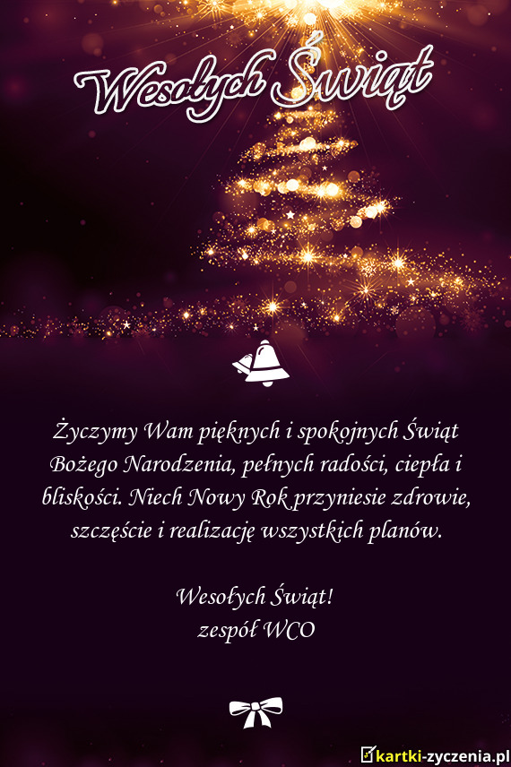 Życzymy Wam zadowolenia i satysfakcji z podejmowanych wyzwań. Niech magiczna moc wigilijnego wieczoru przyniesie Wam spokój, wytchnienie i radość. Każda chwila świąt Bożego Narodzenia niech żyje własnym pięknem, a Nowy Rok obdaruje Was zdrowiem, pomyślnością i szczęściem. Najpiękniejszych świąt Bożego Narodzenia!