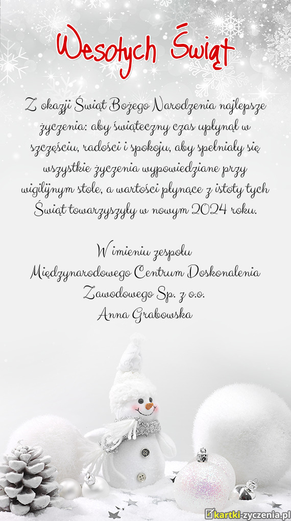 Z okazji Świąt Bożego Narodzenia najlepsze życzenia: aby świąteczny czas upłynął w szczęściu, radości i spokoju, aby spełniały się wszystkie życzenia wypowiedziane przy wigilijnym stole, a wartości płynące z istoty tych Świąt towarzyszyły w nowym 2024 roku.