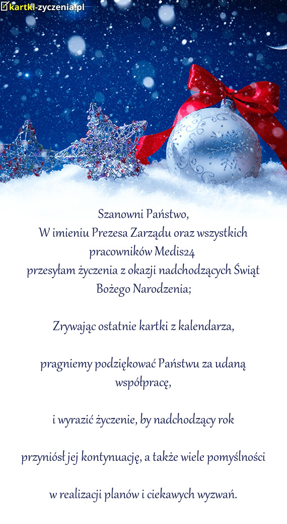 W imieniu Prezesa Zarządu oraz wszystkich pracowników Medis24 - Gotowa Kartka bożonarodzeniowa