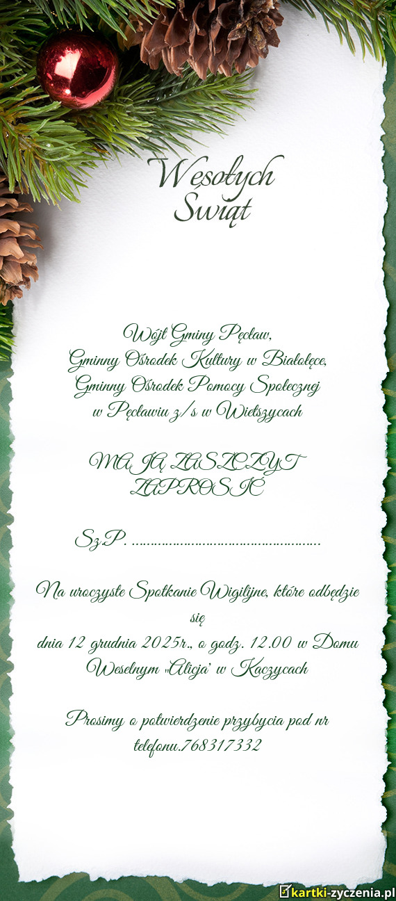 dnia 12 grudnia 2025r., o godz. 12.00 w Domu Weselnym „Alicja” w Kaczycach