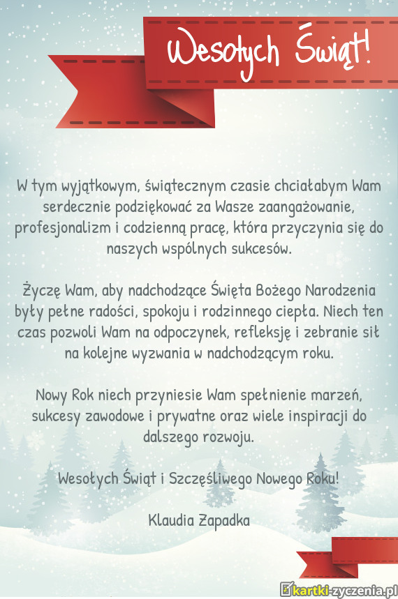 W tym wyjątkowym, świątecznym czasie chciałabym Wam serdecznie podziękować za Wasze zaangażow - Gotowa Kartka bożonarodzeniowa