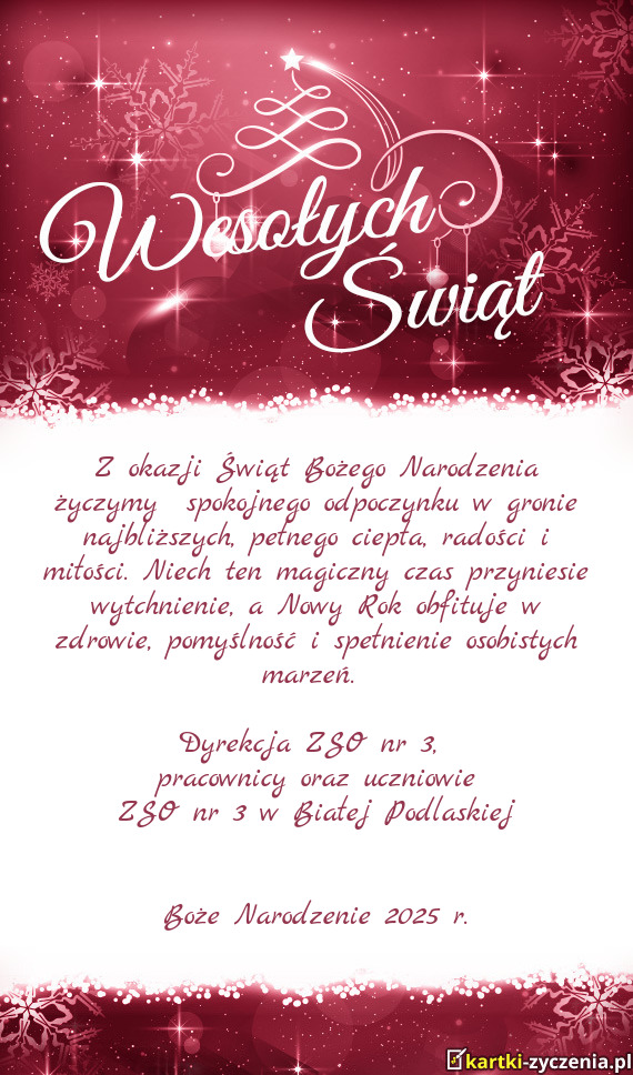 Z okazji Świąt Bożego Narodzenia życzymy spokojnego odpoczynku w gronie najbliższych, pełnego ciepła, radości i miłości. Niech ten magiczny czas przyniesie wytchnienie, a Nowy Rok obfituje w zdrowie, pomyślność i spełnienie osobistych marzeń.