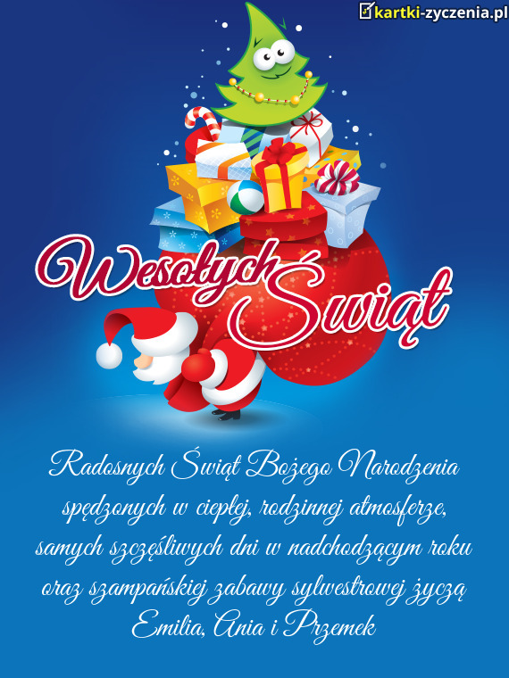 Wych dni w nadchodzącym roku oraz szampańskiej zabawy sylwestrowej życzą Emilia, Ania i Przemek - Gotowa Kartka bożonarodzeniowa
