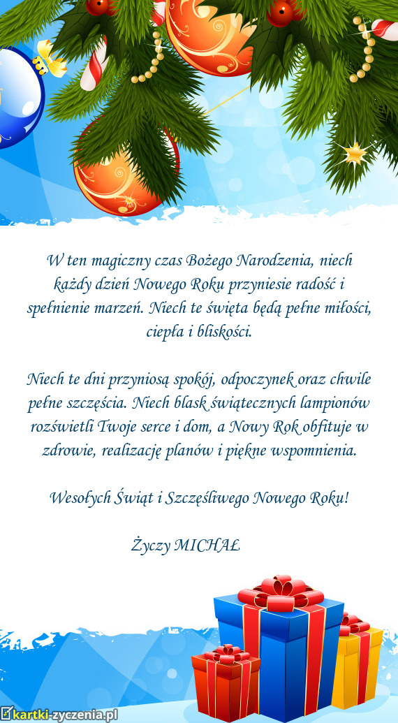 Z okazji Bożego Narodzenia życzę Ci dużego szczęścia, słodkiej miłości, ciepłych pierniczk - Gotowa Kartka bożonarodzeniowa