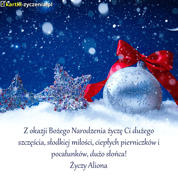 Z okazji Bożego Narodzenia życzę Ci dużego szczęścia, słodkiej miłości, ciepłych pierniczków i pocałunków, dużo słońca!