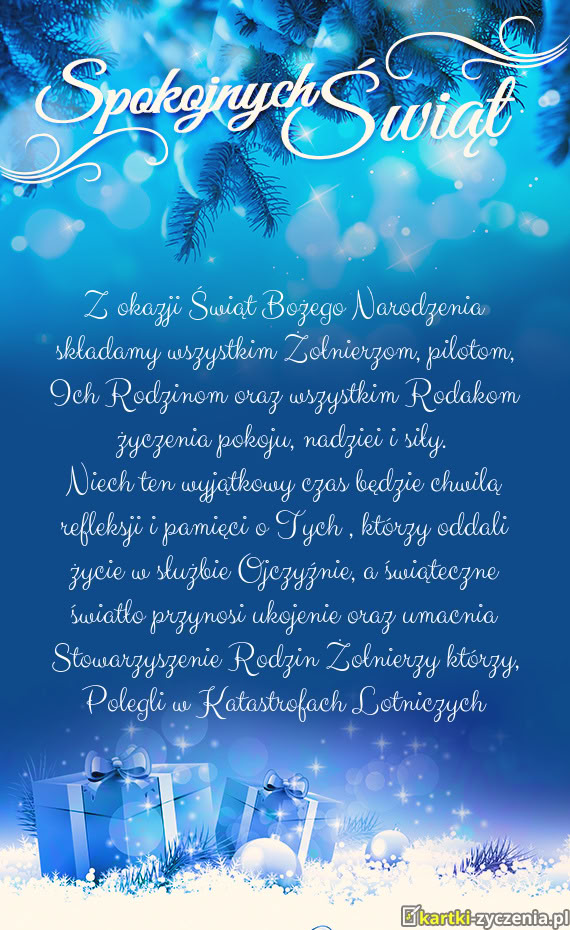 Z okazji Bożego Narodzenia życzę Ci mocnego zdrowia, szczęścia, dobrych przyjaciół, niech następny rok będzie pełen przyjemnych chwil, życzę radosnych i rodzinnych świat.