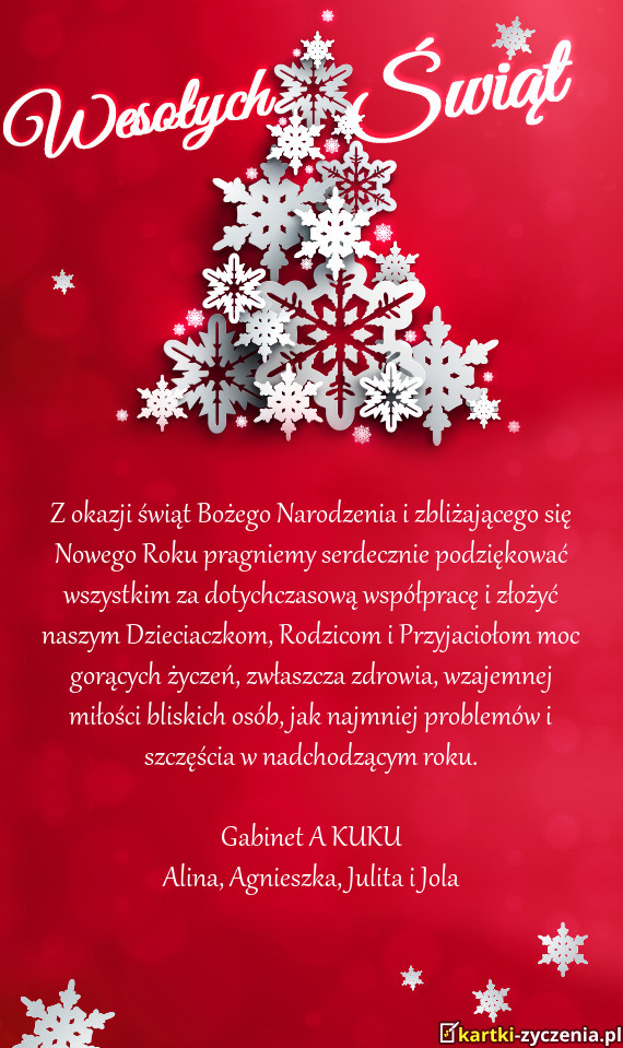 Z okazji świąt Bożego Narodzenia i zbliżającego się Nowego Roku pragniemy serdecznie podziękować wszystkim za dotychczasową współpracę i złożyć naszym Dzieciaczkom, Rodzicom i Przyjaciołom moc gorących życzeń, zwłaszcza zdrowia, wzajemnej miłości bliskich osób, jak najmniej problemów i szczęścia w nadchodzącym roku.