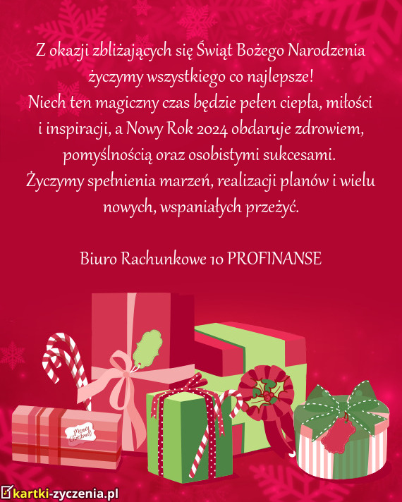 Z okazji Świąt Bożego Narodzenia składam najserdeczniejsze życzenia. Niech te chwile napełnią Was radością, spokojem i ciepłem rodzinnego szczęścia. Życzę Wam niezapomnianych chwil w gronie najbliższych, pełnych uścisków, uśmiechów i dobrych słów.