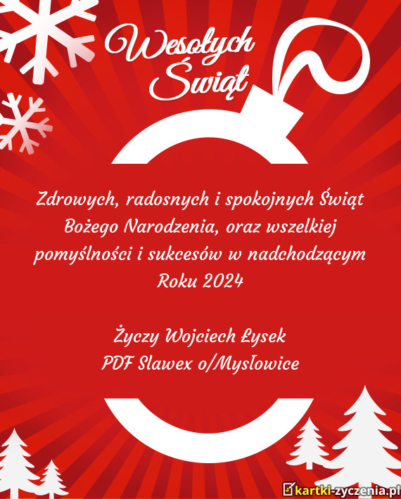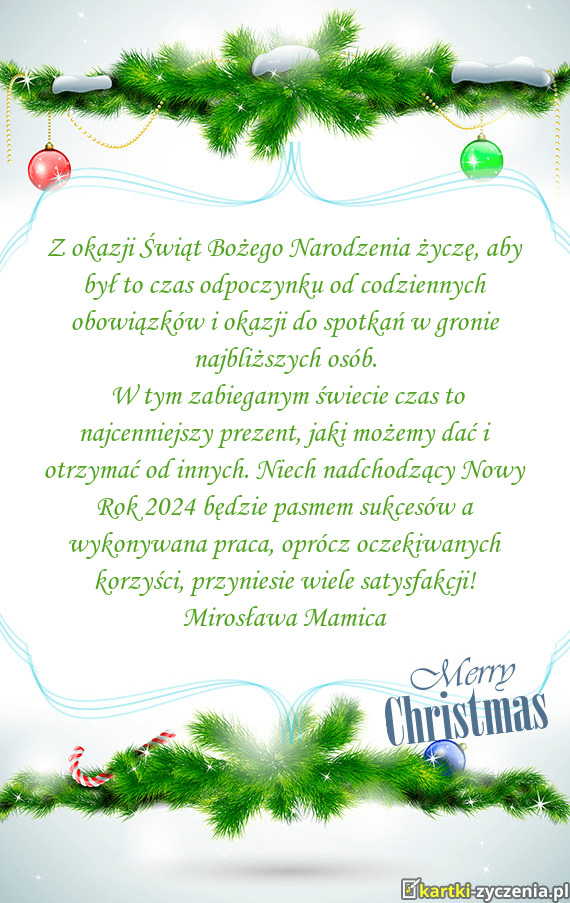 Z okazji Świąt Bożego Narodzenia życzę, aby był to czas odpoczynku od codziennych obowiązków i okazji do spotkań w gronie najbliższych osób.