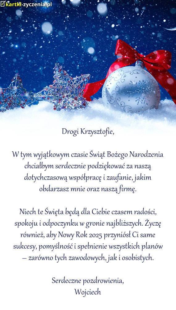 Z okazji Świąt Bożego Narodzenia życzę Wam wiele radości, ciepła i miłości. Niech wigilijny wieczór przyniesie pokój i harmonię, a blask choinki oświetli drogę do spełnienia marzeń. Życzę, aby każda chwila tych świąt była przepełniona serdecznością, a Nowy Rok obfitował w zdrowie, szczęście i pomyślność. Wesołych Świąt i szczęśliwego Nowego Roku!