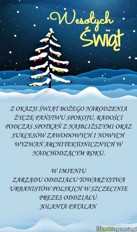 Z OKAZJI ŚWIĄT BOŻEGO NARODZENIA ŻYCZYMY PAŃSTWU SPOKOJU, RADOŚCI PODCZAS SPOTKAŃ Z NAJBLIŻSZYMI ORAZ SUKCESÓW ZAWODOWYCH I NOWYCH WYZWAŃ ARCHITEKTONICZNYCH W NADCHODZĄCYM ROKU.