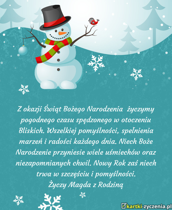Z okazji Świąt Bożego Narodzenia życzymy pogodnego czasu spędzonego w otoczeniu Bliskich. Wsze - Gotowa Kartka bożonarodzeniowa