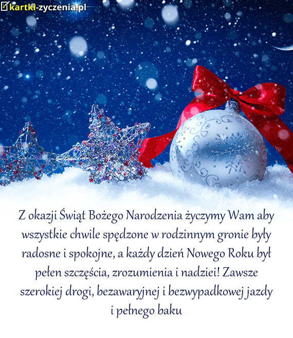 Z okazji Świąt Bożego Narodzenia życzymy Wam aby wszystkie chwile spędzone w rodzinnym gronie były radosne i spokojne, a każdy dzień Nowego Roku był pełen szczęścia, zrozumienia i nadziei! Zawsze szerokiej drogi, bezawaryjnej i bezwypadkowej jazdy i pełnego baku
