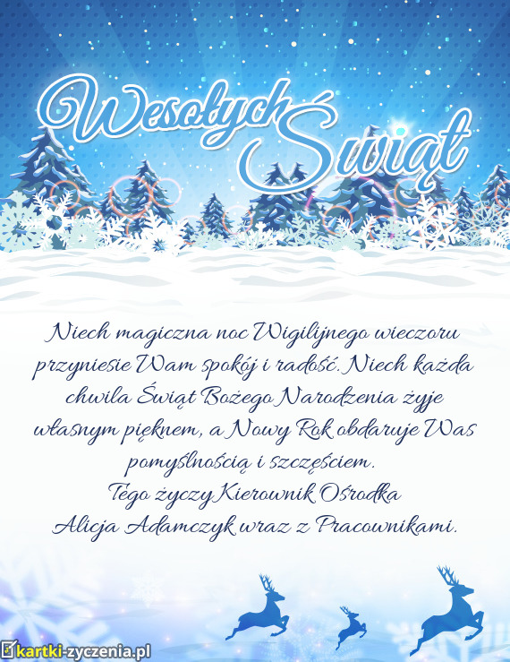 Spokojnych i radosnych świąt spędzonych w gronie najbliższych osób, a także zdrowia, szczęścia i wielkiej radości, życzy