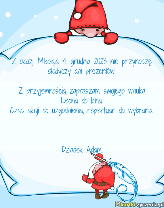 Z przyjemnością zapraszam swojego wnuka Cezarego do kina - Gotowa Kartka bożonarodzeniowa