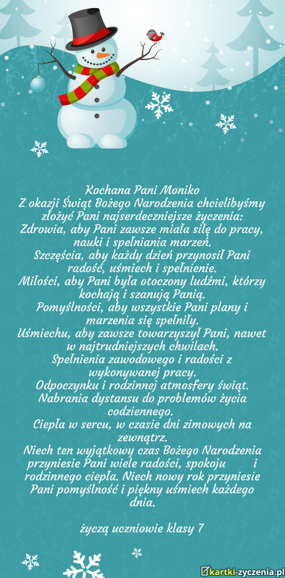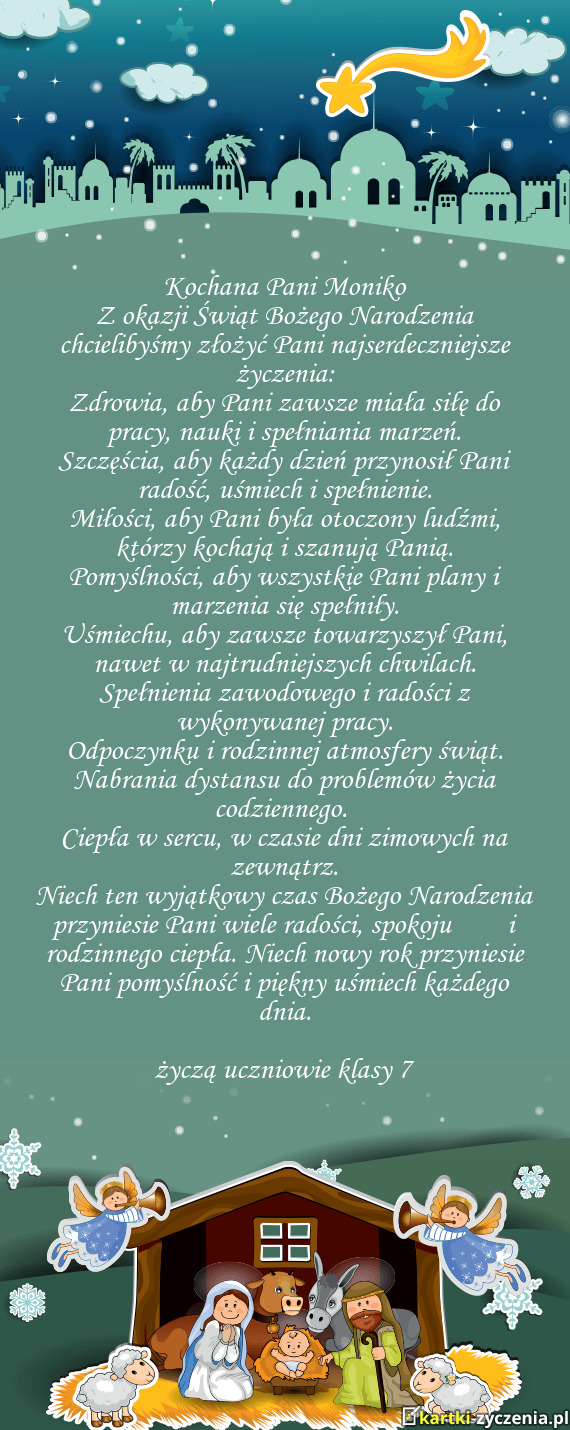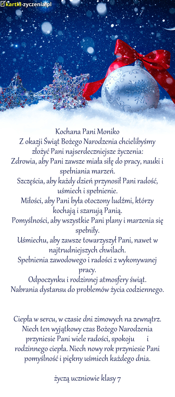 Niech ten wyjątkowy czas Bożego Narodzenia przyniesie Pani wiele radości, spokoju i rodzinnego ciepła. Niech nowy rok przyniesie Pani pomyślność i piękny uśmiech każdego dnia.