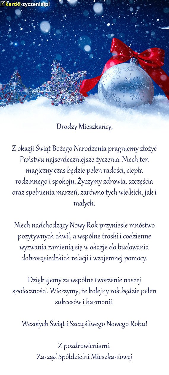 Pełni wdzięczności za otwarcie serc na drugiego człowieka, życzymy Państwu z okazji Świąt Bożego Narodzenia zdrowia, miłości, wiary i nadziei. Niech ten szczególny czas przeniesie radość i energię na nadchodzący rok!