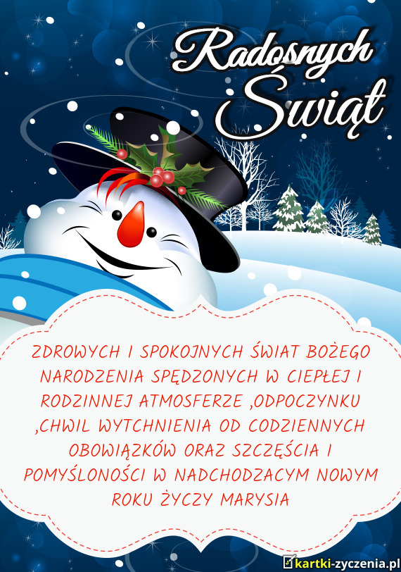 ZDROWYCH I SPOKOJNYCH ŚWIAT BOŻEGO NARODZENIA SPĘDZONYCH W CIEPŁEJ I RODZINNEJ ATMOSFERZE ,ODPOCZYNKU ,CHWIL WYTCHNIENIA OD CODZIENNYCH OBOWIĄZKÓW ORAZ SZCZĘŚCIA I POMYŚLONOŚCI W NADCHODZACYM NOWYM ROKU ŻYCZY MARYSIA