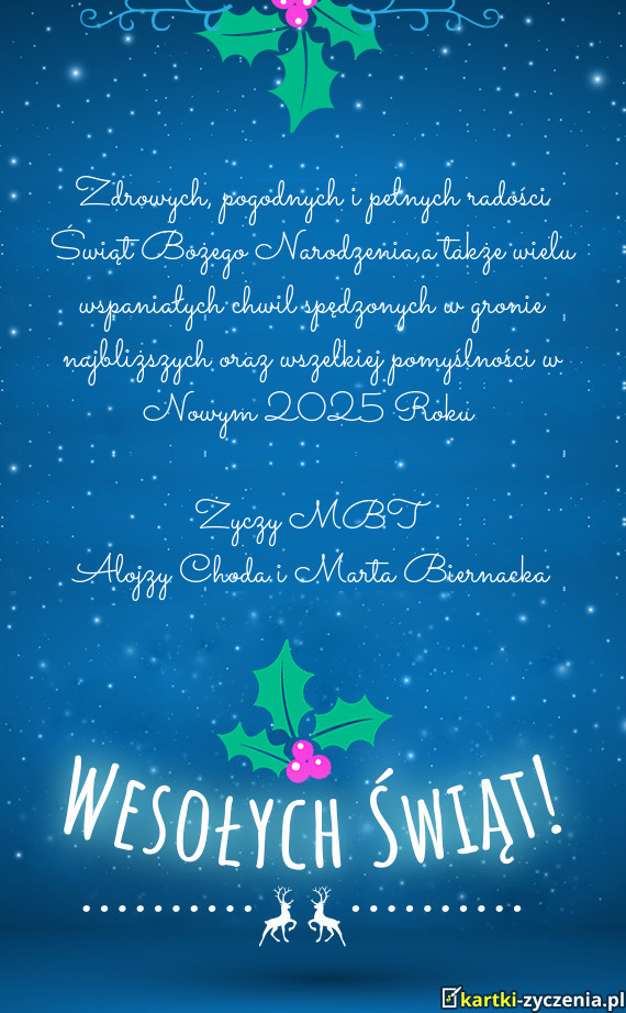 Zdrowych, pogodnych i pełnych radości Świąt Bożego Narodzenia,a także wielu wspaniałych chwil spędzonych w gronie najbliższych oraz wszelkiej pomyślności w Nowym 2025 Roku