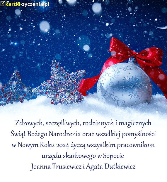 Zdrowych, szczęśliwych, rodzinnych i magicznych Świąt Bożego Narodzenia oraz wszelkiej pomyślności w Nowym Roku 2024 życzą wszystkim pracownikom urzędu skarbowego w Sopocie