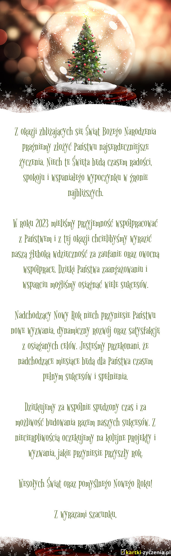 W roku 2023 mieliśmy przyjemność współpracować z Państwem i z tej okazji chcielibyśmy wyrazić naszą głęboką wdzięczność za zaufanie oraz owocną współpracę. Dzięki Państwa zaangażowaniu i wsparciu mogliśmy osiągnąć wiele sukcesów.
